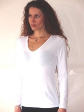 Dámské tričko V z jednobarevného úpletu, vhodné samostatně i do kostýmů, ve velikostech XS,S,M,L,XL. Materiál 95% viskoza 5% elastan.
