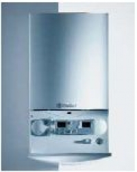 Závěsný plynový kotel s vestavěným zásobníkem TUV, odtah spalin obvodovou stěnou nebo střechou.