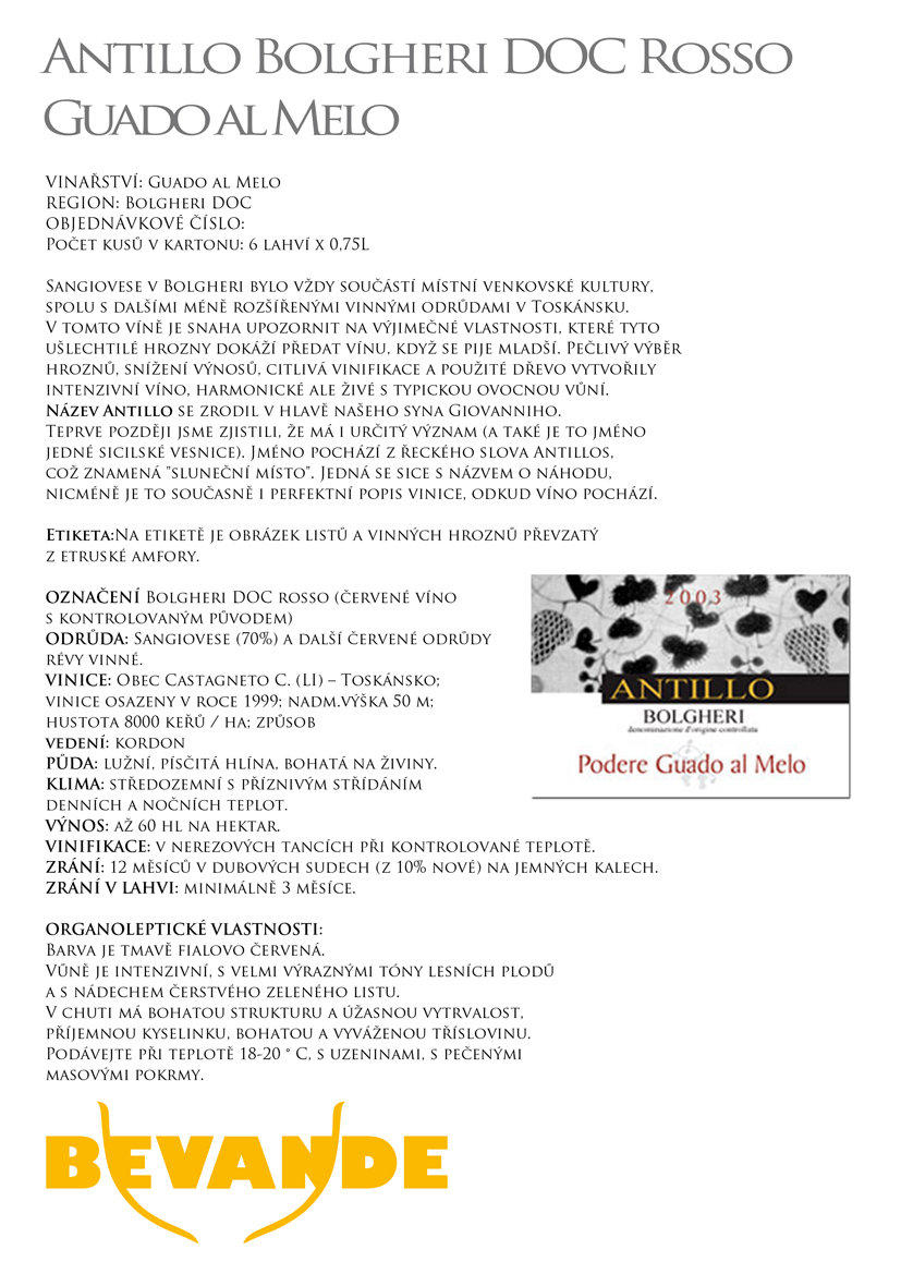 V tomto víně je snaha upozornit na vyjímečné vlastnosti, které vínu ušlechtilé hrozny dokaží předat, když se pije mladší. Pečlivý výběr hroznů, snížený výnos a citlivá vinifikace a použité dřevo vytvořily intenzivní víno, harmonické, ale živé s typickou ovocnou vůní. OBLAST PRODUKCE: Toskánsko, obec Castagneto ODRŮDA: Sangiovese a další červené odrůdy révy vinné HEKTAROVÝ VÝNOS: 60 hl na hektar OBSAH ALKOHOLU: 13% BARVA: tmavě fialovo červená VŮNĚ: intenzivní s velmi výraznými tóny lesních plodů a nádechem čerstvého zelenho listu CHUŤ: má bohatou strukturu a úžasnou vytrvalost, příjemnou kyselinku, bohatou a vyváženou tříslovinu DOPORUČENÉ SNOUBENÍ S JÍDLEM: vhodné k uzeninám a pečeným masovým pokrmům TEPLOTA PODÁVÁNÍ: 18 - 20 ° C