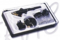 Air brush kit. Sada obsahuje stříkací pistoli, dvě spodní nádobky, hadici a klíč.