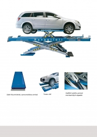 Rovné plošiny do příjmu, s vybráním pro přední otočné desky a zadními deskami s pneumatickou aretací pro měření geometrie, s testerem vůlí, s nůžkovým přízdvihem vozidla za prahy, provedení na podlahu i zapuštěné do podlahy, nosnost 3.500/4.200/5.000/6.000 kg, délka plošin 4.600/5.500 mm.